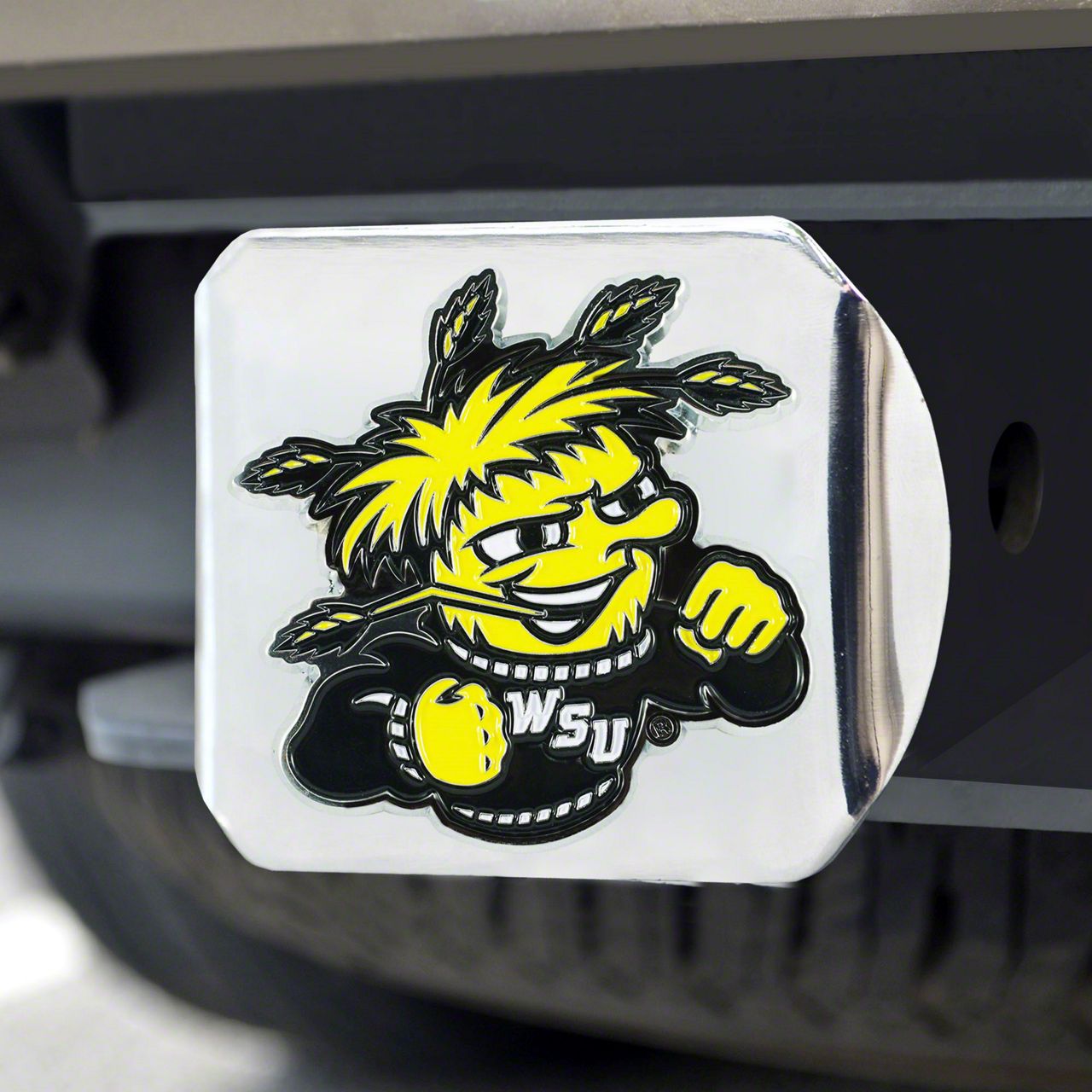 Description. Hitch Cover; Color Hitch Cover; Chrome; Wichita State University; 3.4"X4"