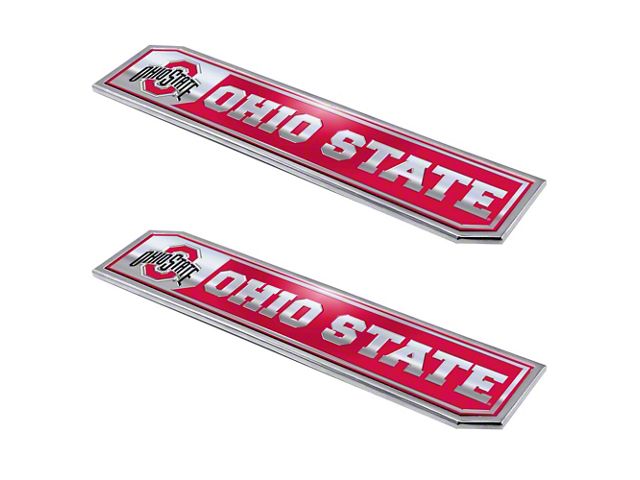 Stylish University Emblem. Show pride for your alma mater and design your car's exterior with this Ohio State University Embossed Emblems; Red. Manufactured for easy styling, it requires no drilling and sports a rust resistant aluminum construction for that bright premium look.
