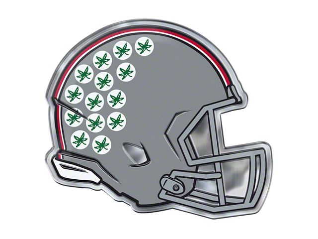 Application. The Ohio State University Embossed Helmet Emblem; Green, Red and Gray fits universal mounting on any vehicle or smooth substrate.