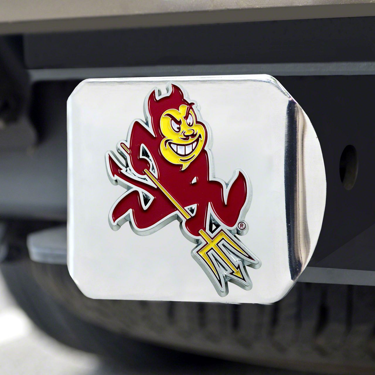 Description. Hitch Cover; Color Hitch Cover; Chrome; Arizona State University; 3.4"X4"