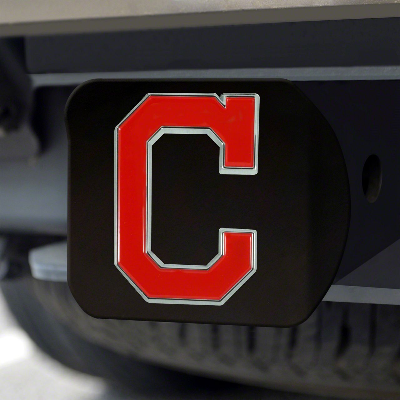 Stylish Hitch Cover for Protection and Personalization. The Hitch Cover features a Cleveland Indians logo design with a glossy black finish, adding a stylish touch to your vehicle. It helps prevent rocks, mud, and other debris from entering the hitch, keeping it clean and functional.
