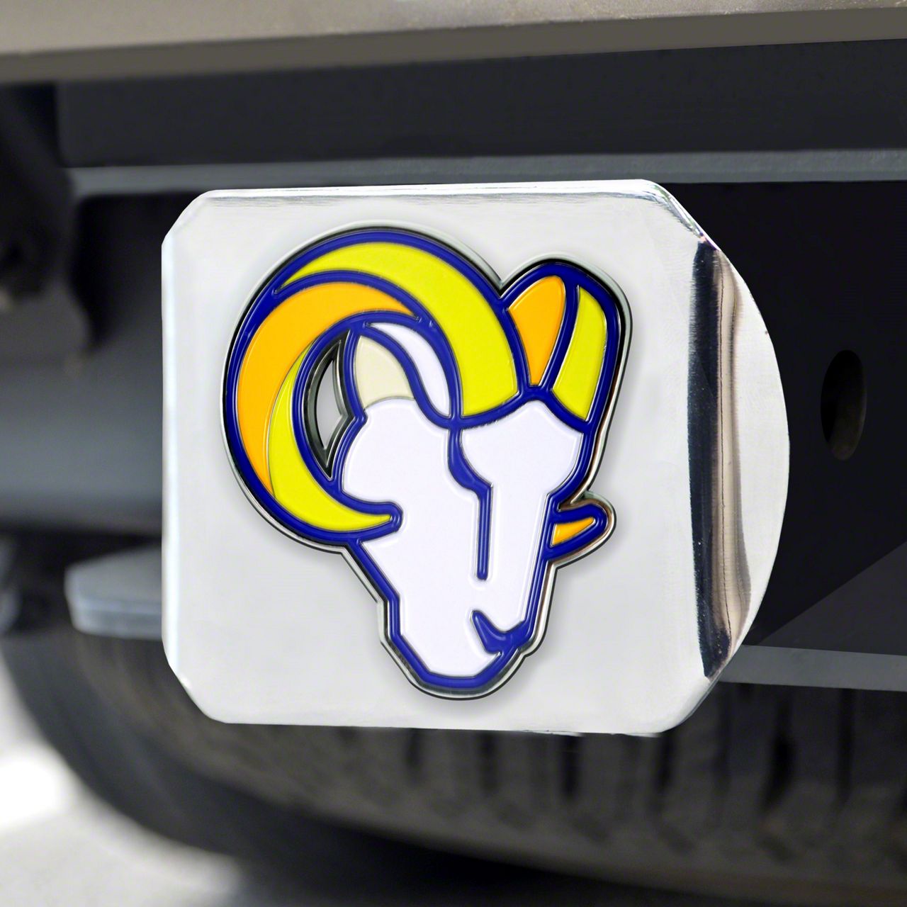 Description. Automotive Accessory; Color Hitch Cover; Chrome; Nfl; Los Angeles Rams ; 3.4"X4"