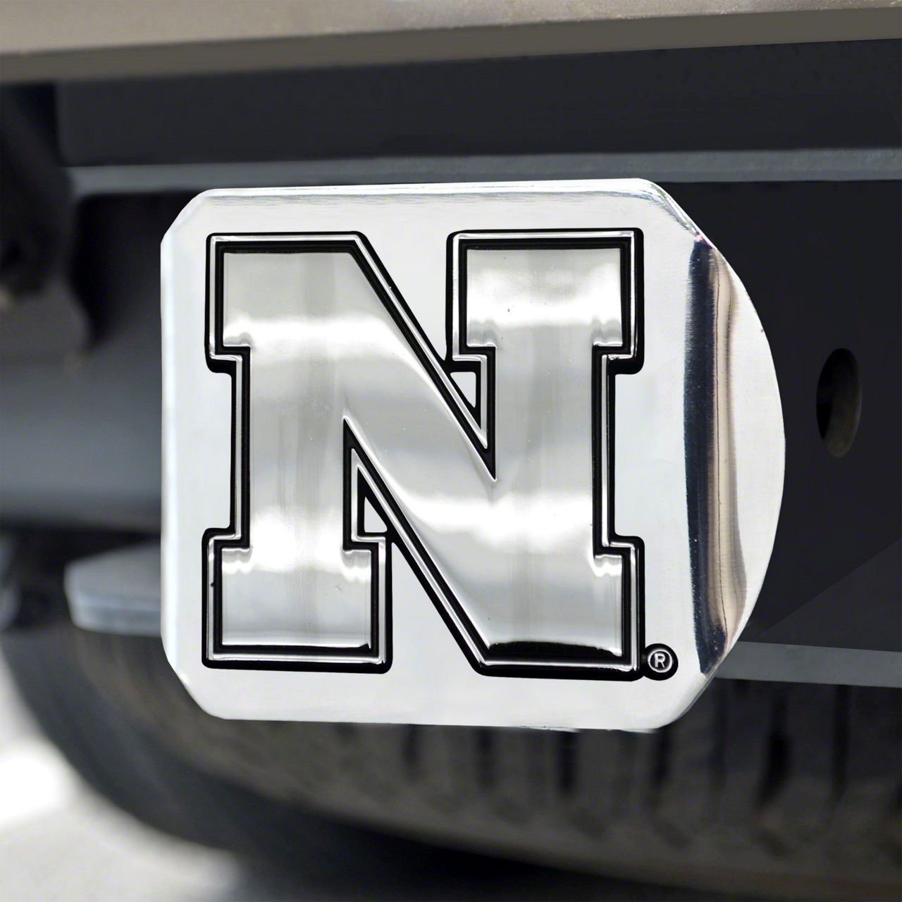Description. Hitch Cover; Hitch Cover; Chrome; University Of Nebraska; 3.4"X4"