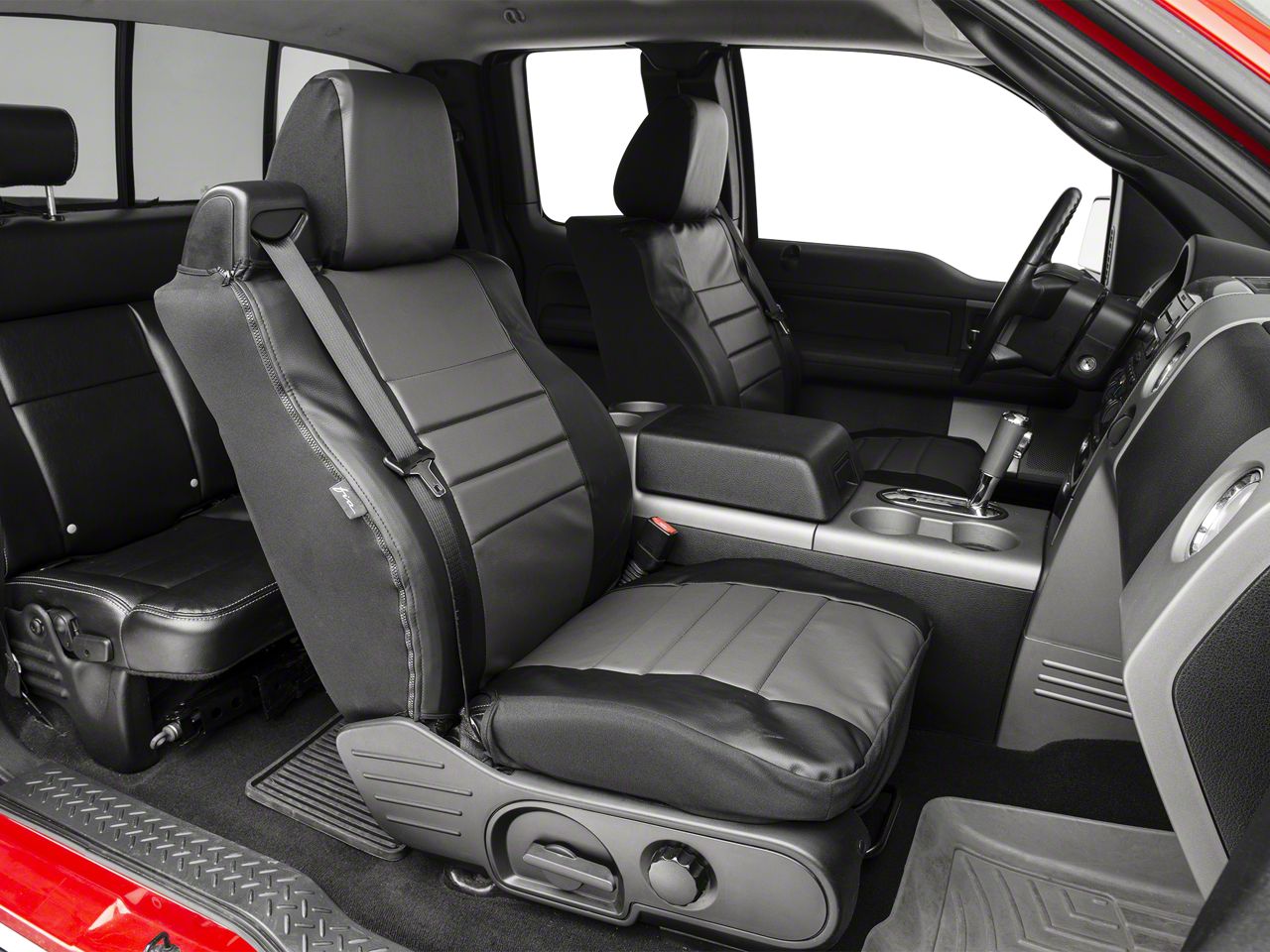 Application. The Fia Custom Fit Leatherlite Front Seat Covers - Gray were designed for Ford F-150 models with bucket seats manufactured from 2004 to 2008. This cover will not fit F-150s with bucket seats that have adjustable headrests and built-in seat belts.