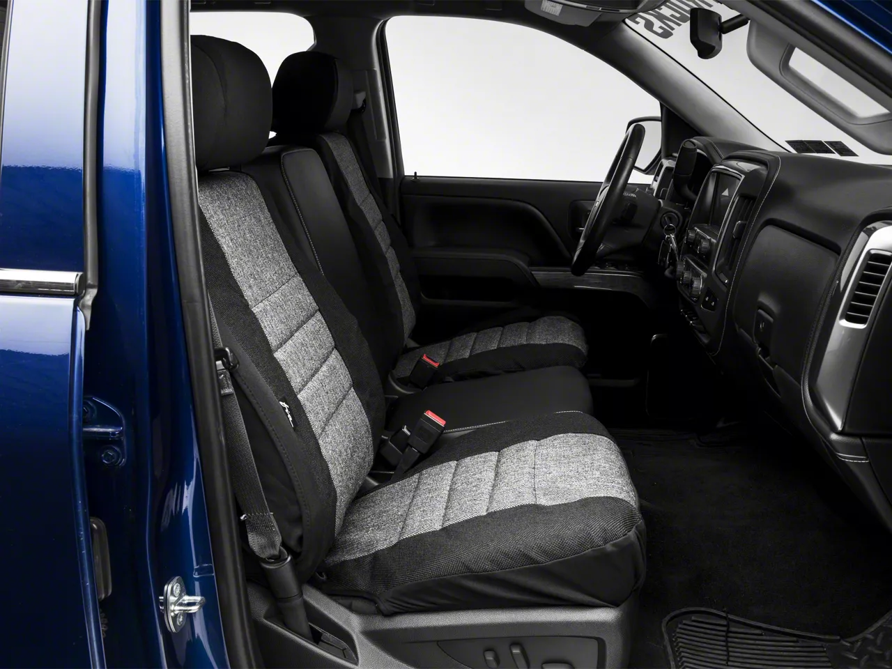 OE Style Seat Protection. Keep the front seats of your 2014-2018 Silverado in pristine condition with a set of Fia Custom Fit Charcoal Tweed Seat Covers. Using an OEM-like tweed material, these covers provide a ranch-esque look that fits in right at home with a factory black interior. Lightweight yet durable, these abrasion resistant covers are flame retardant and feature additional padding for extra passenger comfort.