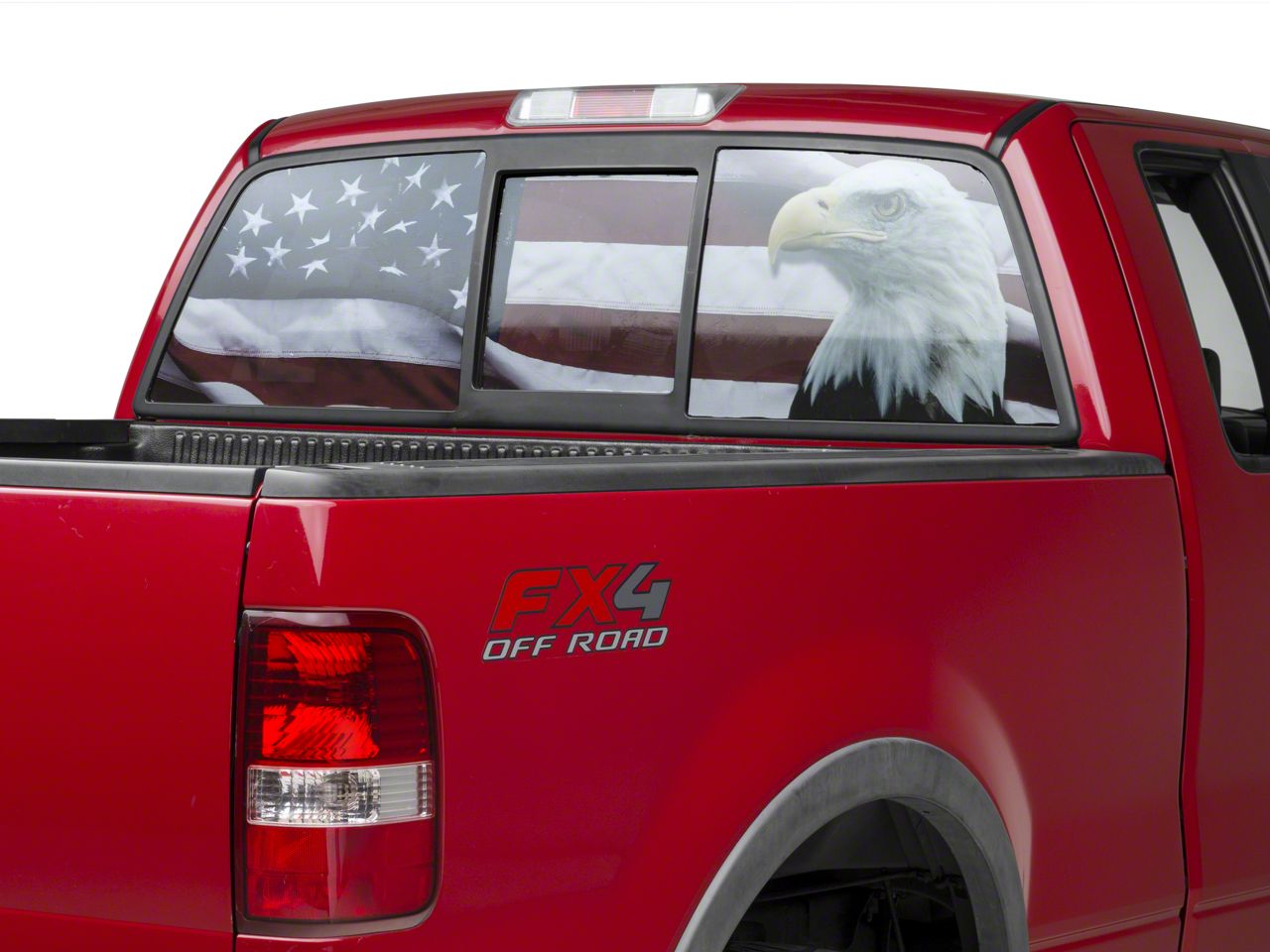 Patriotic Styling. What is more American than the combination of the American Flag and a Bald Eagle? Featuring a vivid full color American Flag on the drive side and spanning across to a beautiful bald eagle on the passenger side, this Perforated Rear Window Decal will proudly show off your patriotism. This stunning Rear Window Graphic is visible from the outside of your 1997-2026 Ford F-150, but you'll still be able to clearly see out of your rear view when sitting inside.