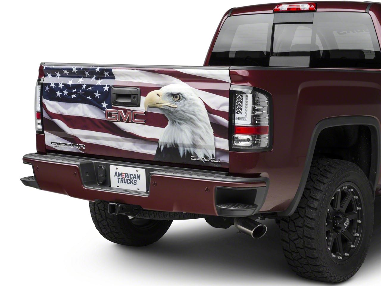 Patriotic Styling. Complete with old glory and an ever vigilant bald eagle, nothing says that you love the good ole USA more than outfitting the tailgate of your Sierra with iconic patriotic symbols. Designed to apply over your Sierra's tailgate, this vinyl decal is an excellent way to cover up any existing scuffs and scratches you may of obtained over years of use and abuse.