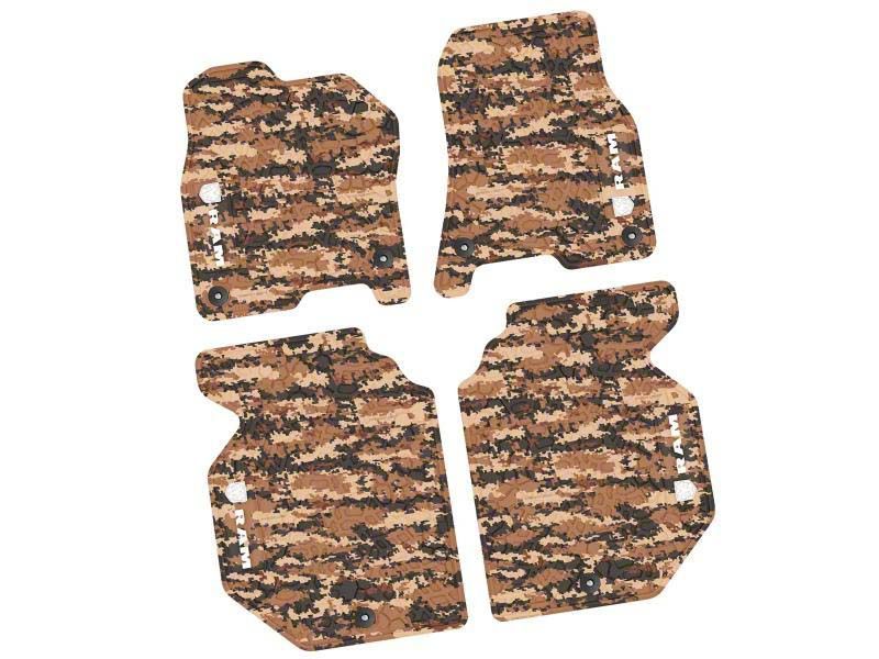 Construction and Appearance. Crafted with an aggressive tire tread and scorched earth texture, these mats offer a rugged look and substantial traction underfoot. The cyberflage camouflage finish and clean white RAM logo add a custom, bold style to your interior, while the deep treads are engineered to trap dirt and moisture. Made in the USA, these mats are built with high-quality materials that ensure durability and long-lasting performance.