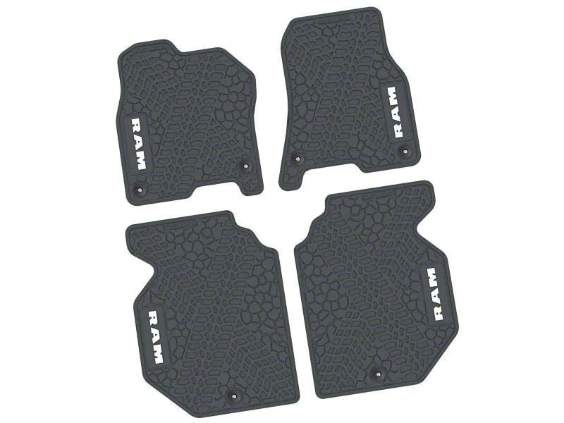 Application. This FLEXTREAD Factory Floorpan Fit Tire Tread/Scorched Earth Scene Front and Rear Floor Mats with White RAM Logo and Text Insert fits 2019-2024 Dodge RAM 1500 Quad Cabs.