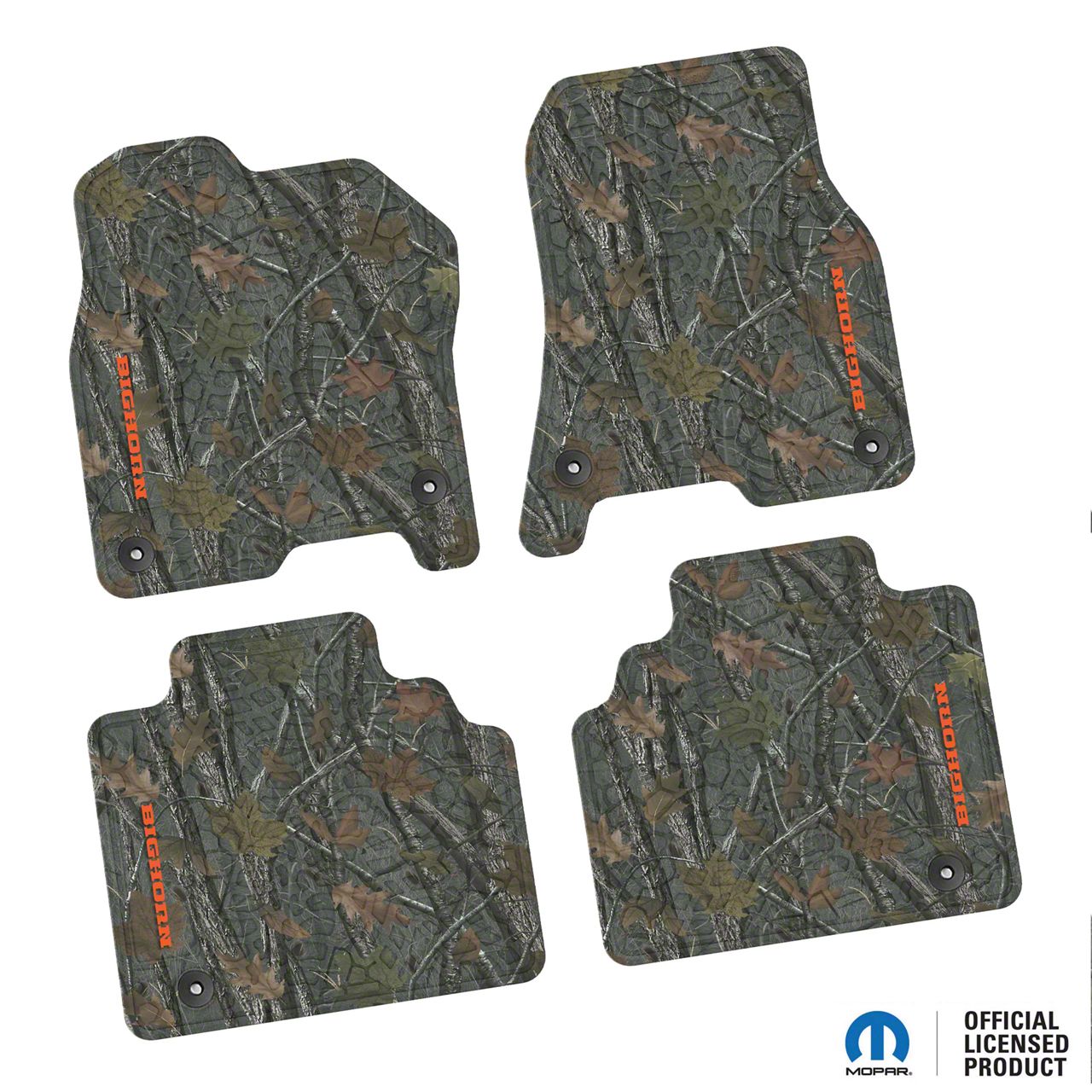 Factory Floorpan Fit Tire Tread/Scorched Earth Scene Front and Rear Floor Mats with Orange Bighorn Insert; Rugged Woods (19-24 RAM 1500 Quad Cab)Find parts that fit my vehicle
