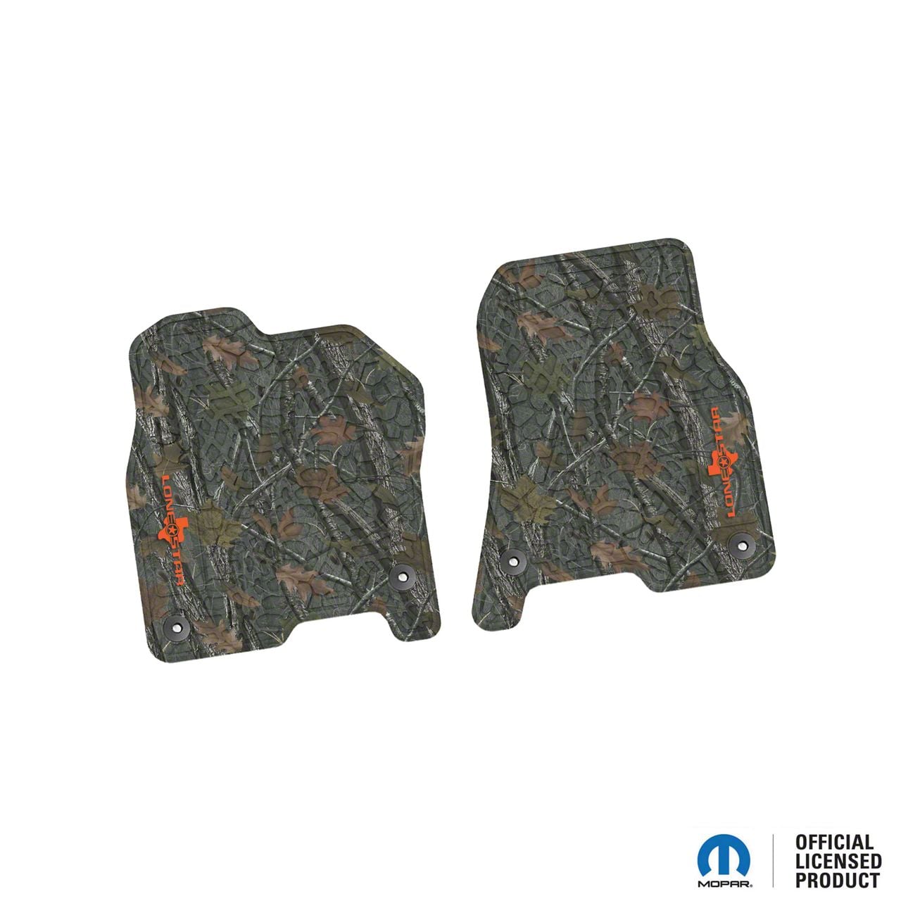 Construction and Appearance. Made from 100 percent virgin flexible PVC, these mats feature an aggressive tread pattern with sharp, well-defined channels that trap contaminants and offer a slip-resistant surface. The distinctive Rugged Woods base color combined with the orange Lone Star logo insert adds a custom, rugged look to your truck’s interior.