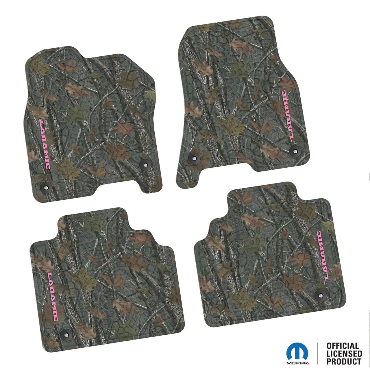 Factory Floorpan Fit Tire Tread/Scorched Earth Scene Front and Rear Floor Mats with Pink Laramie Insert; Rugged Woods (19-24 RAM 1500 Quad Cab)Find parts that fit my vehicle