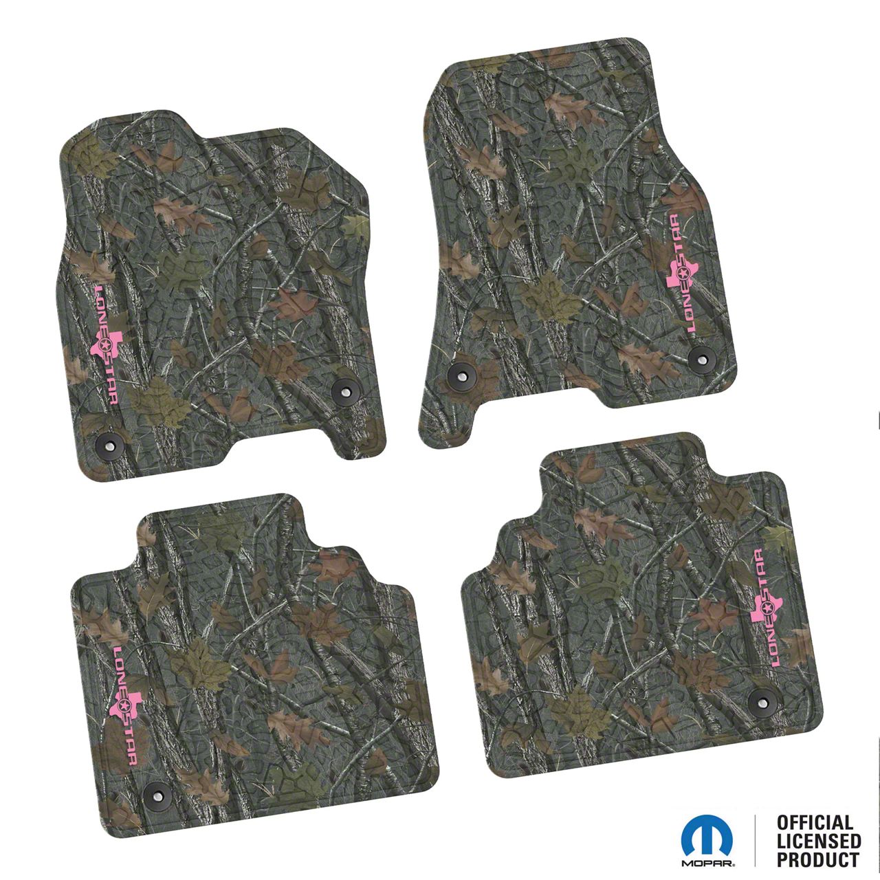Factory Floorpan Fit Tire Tread/Scorched Earth Scene Front and Rear Floor Mats with Pink Lone Star Insert; Rugged Woods (19-24 RAM 1500 Quad Cab)Find parts that fit my vehicle