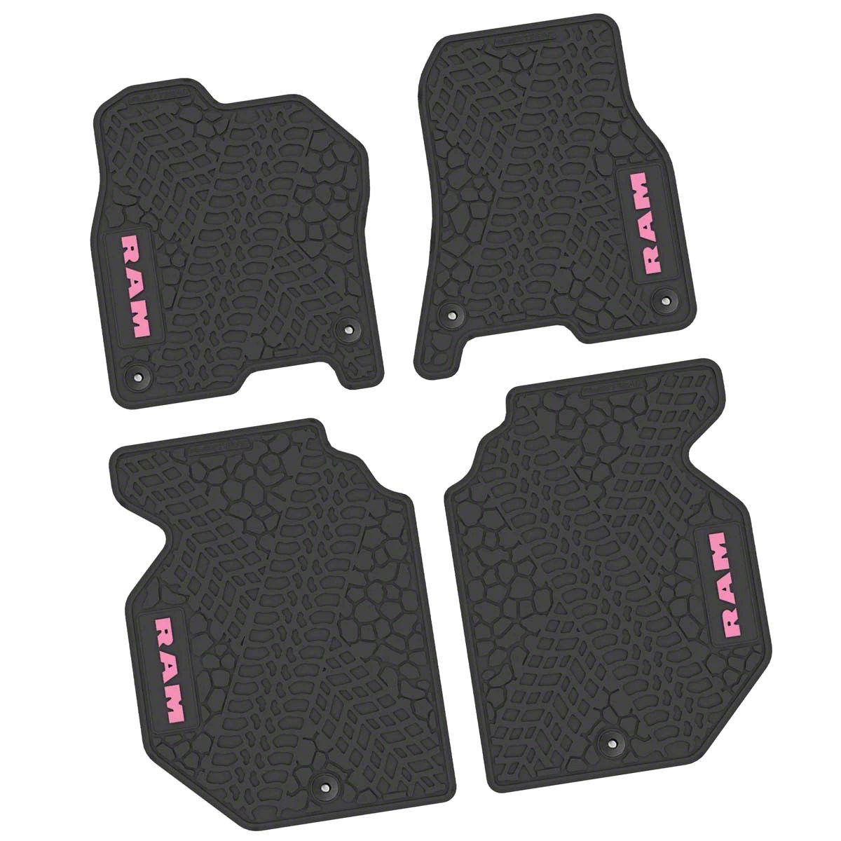 Durable, Stylish Floor Mats. Elevate the interior of your RAM 1500 Crew Cab with the FLEXTREAD Factory Floorpan Fit Tire Tread/Scorched Earth Scene Floor Mats, featuring a distinctive Pink RAM Logo and Text Insert against a rugged black backdrop. These officially licensed RAM product floor mats are meticulously designed to shield your vehicle's floor from dirt, debris, and spills, ensuring a pristine interior under any conditions.