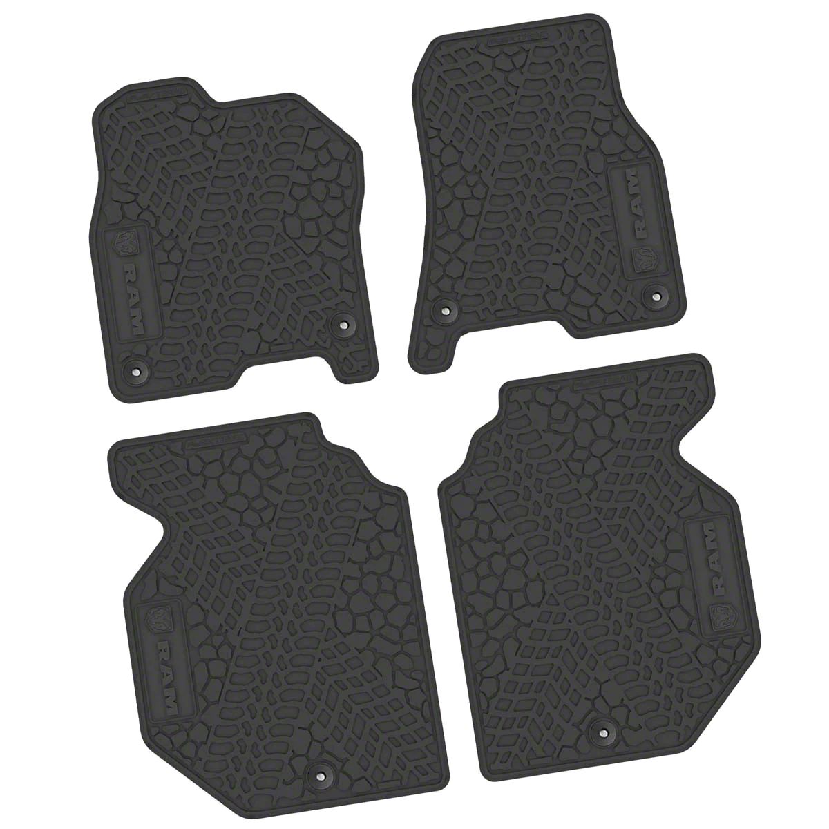 Ultimate Interior Protection. FLEXTREAD Factory Floorpan Fit Tire Tread/Scorched Earth Scene Front and Rear Floor Mats with RAM Logo and Text Insert; Black are meticulously designed to precisely fit your vehicle ensuring an exact fit for your interior. Whether you drive a car, truck, Jeep, SUV, or an off-road vehicle, these mats are your ultimate interior protection. Their purpose is clear: to keep your vehicle's interior looking like new by safeguarding it from stains and wear.