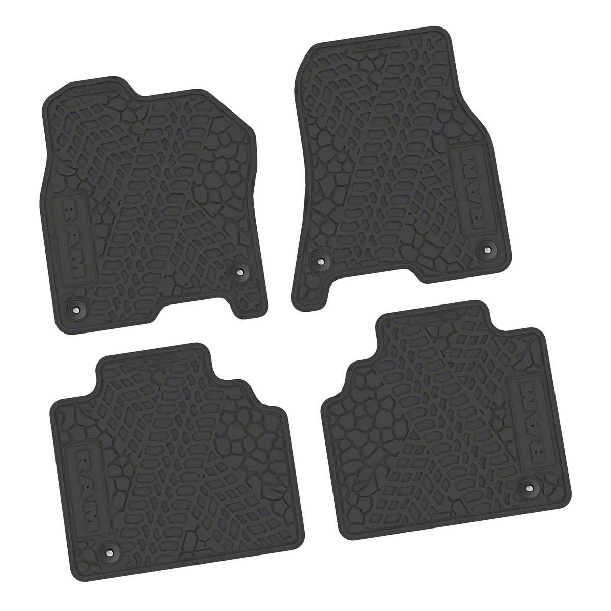 Factory Floorpan Fit Tire Tread/Scorched Earth Scene Front and Rear Floor Mats with RAM Text; Black (19-24 RAM 1500 Quad Cab)Find parts that fit my vehicle
