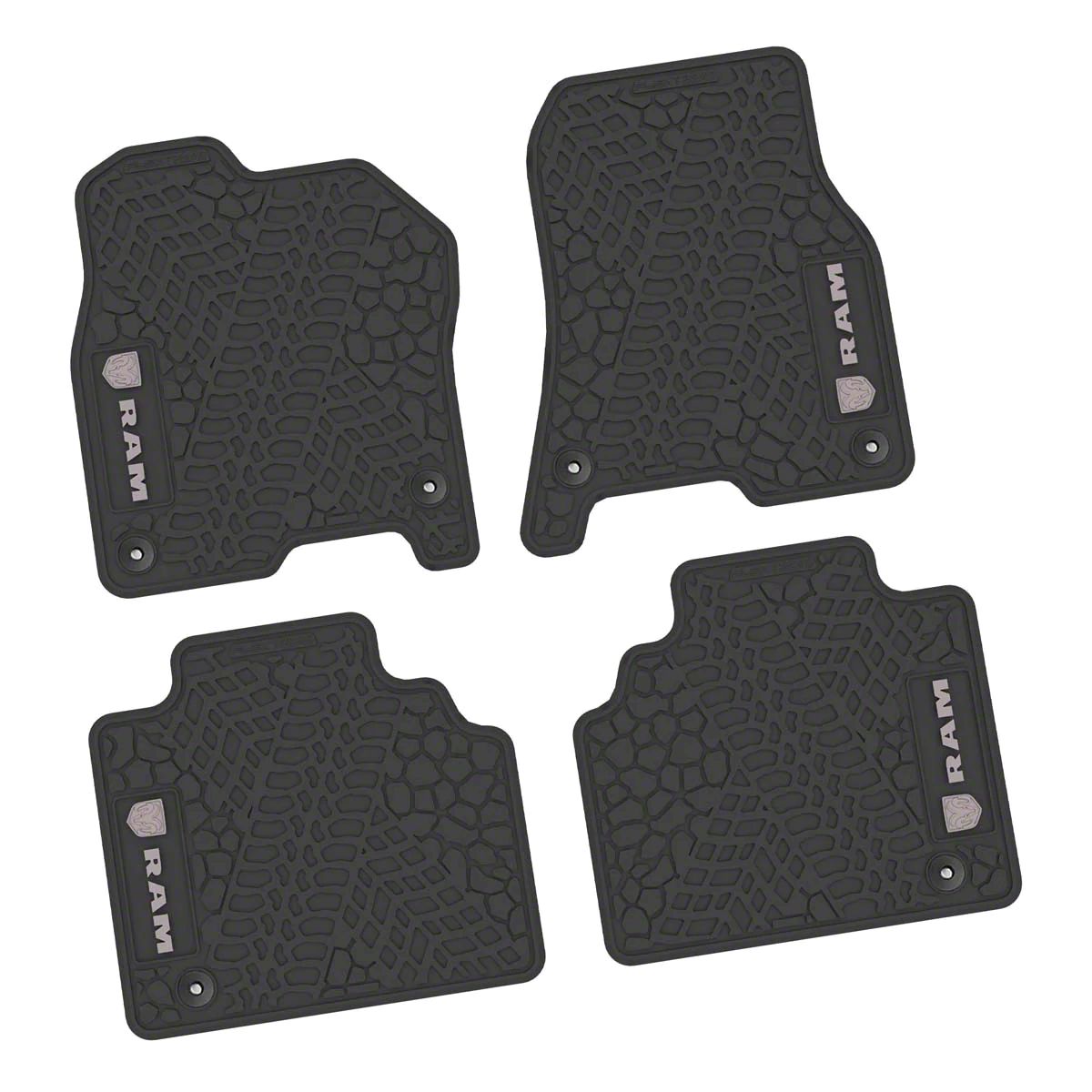 Application. These Factory Floorpan Fit Tire Tread/Scorched Earth Scene Front and Rear Floor Mats with Silver RAM Logo and Text Insert are designed to fit 2019-2024 RAM 1500 Quad Cab models.