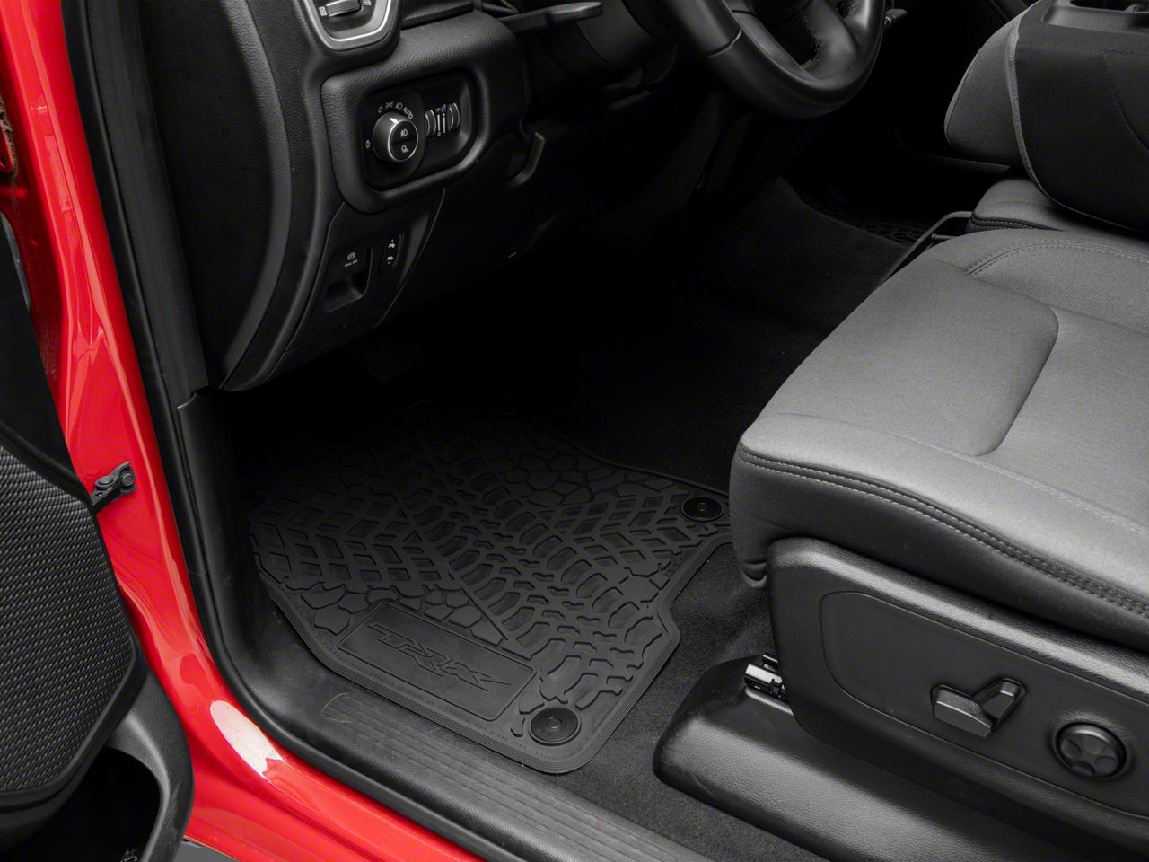 Rugged and Custom Floor Mats. The FLEXTREAD Factory Floorpan Fit Front and Rear Floor Mats are designed with a unique tire tread and scorched earth scene, offering a rugged aesthetic that complements your RAM 1500. Featuring a bold TRX insert, these mats provide both protection and a touch of custom style.