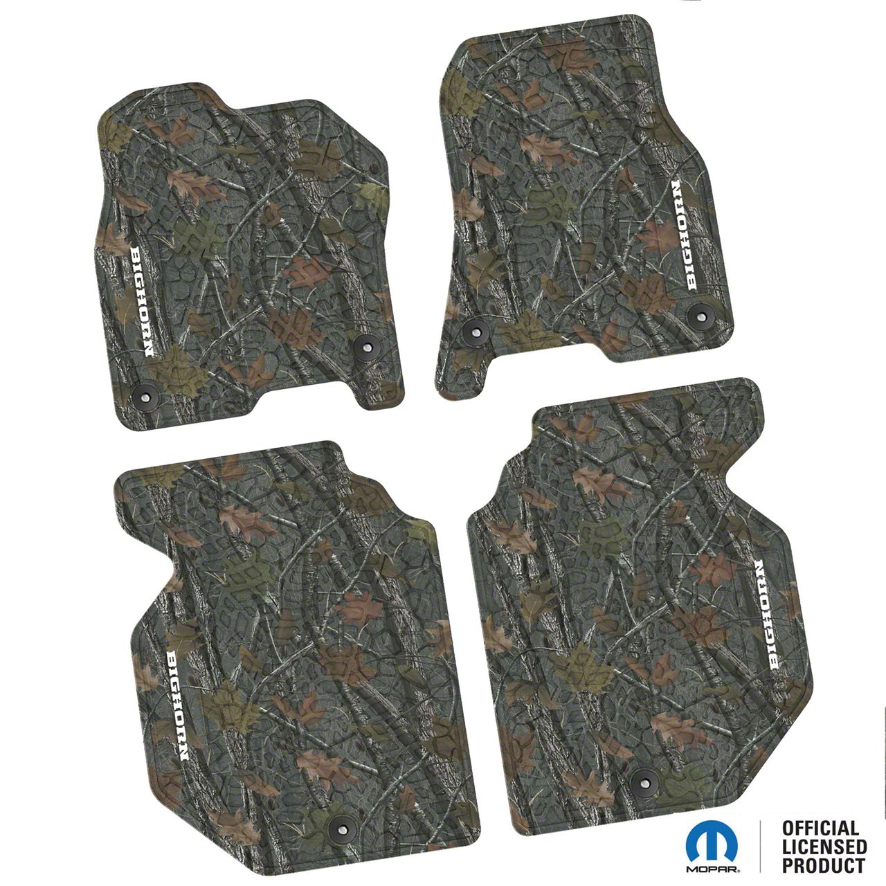 Application. The FLEXTREAD Factory Floorpan Fit Tire Tread/Scorched Earth Scene Front and Rear Floor Mats with White Big Horn Insert; Rugged Woods are compatible with 2019–2024 RAM 1500 Crew Cab models.