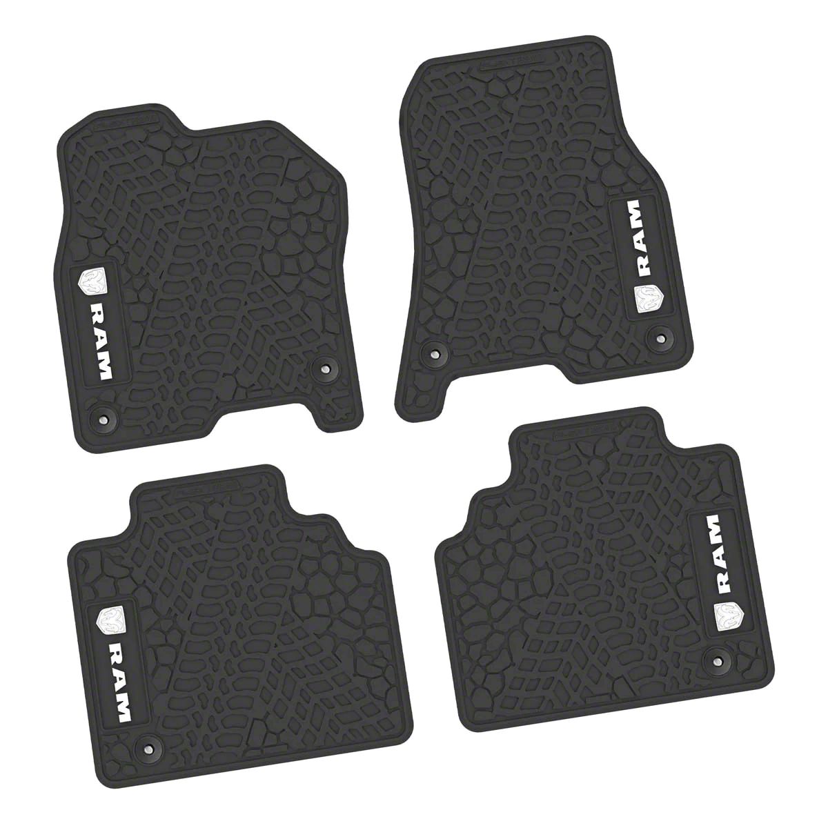 Application. This FLEXTREAD Factory Floorpan Fit Tire Tread/Scorched Earth Scene Front and Rear Floor Mats with White RAM Logo and Text Insert fits 2019-2024 Dodge RAM 1500 Quad Cabs.
