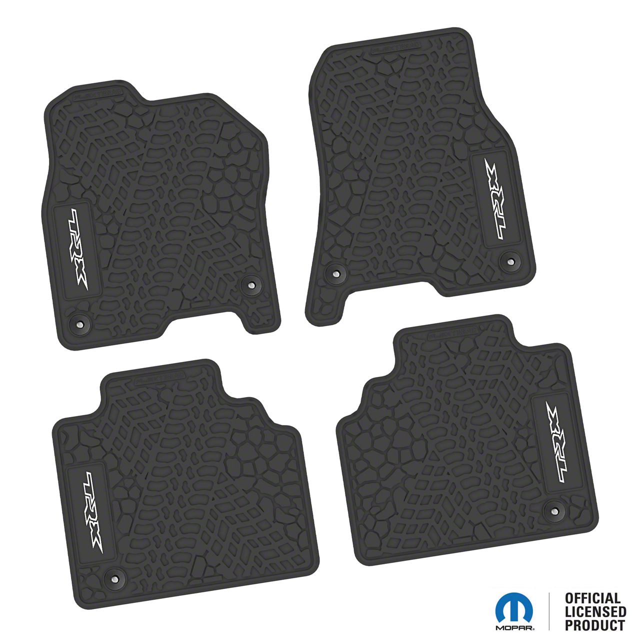 Installation. The installation of Factory Floorpan Fit Tire Tread/Scorched Earth Scene Front and Rear Floor Mats with White TRX Insert is hassle-free and does not require any bolting or drilling. When you receive these mats, you can expect them to be precisely designed to fit your vehicle's interior.