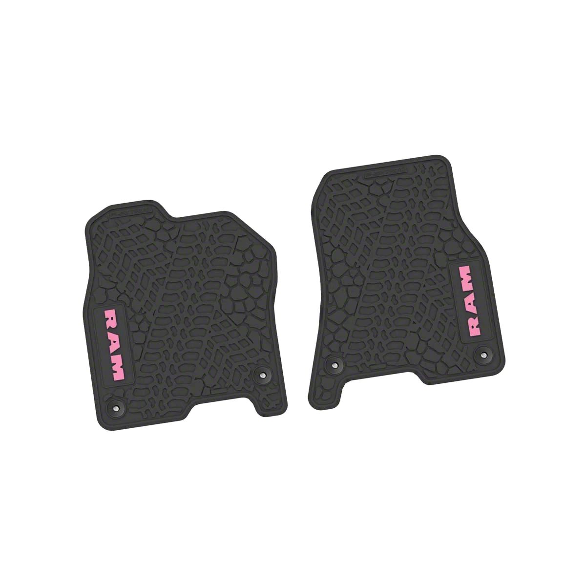 Application. These FLEXTREAD Factory Floorpan Fit Tire Tread/Scorched Earth Scene Front Floor Mats with Pink RAM Logo and Text Insert fit all 2019-2024 Dodge RAM 1500 Models.