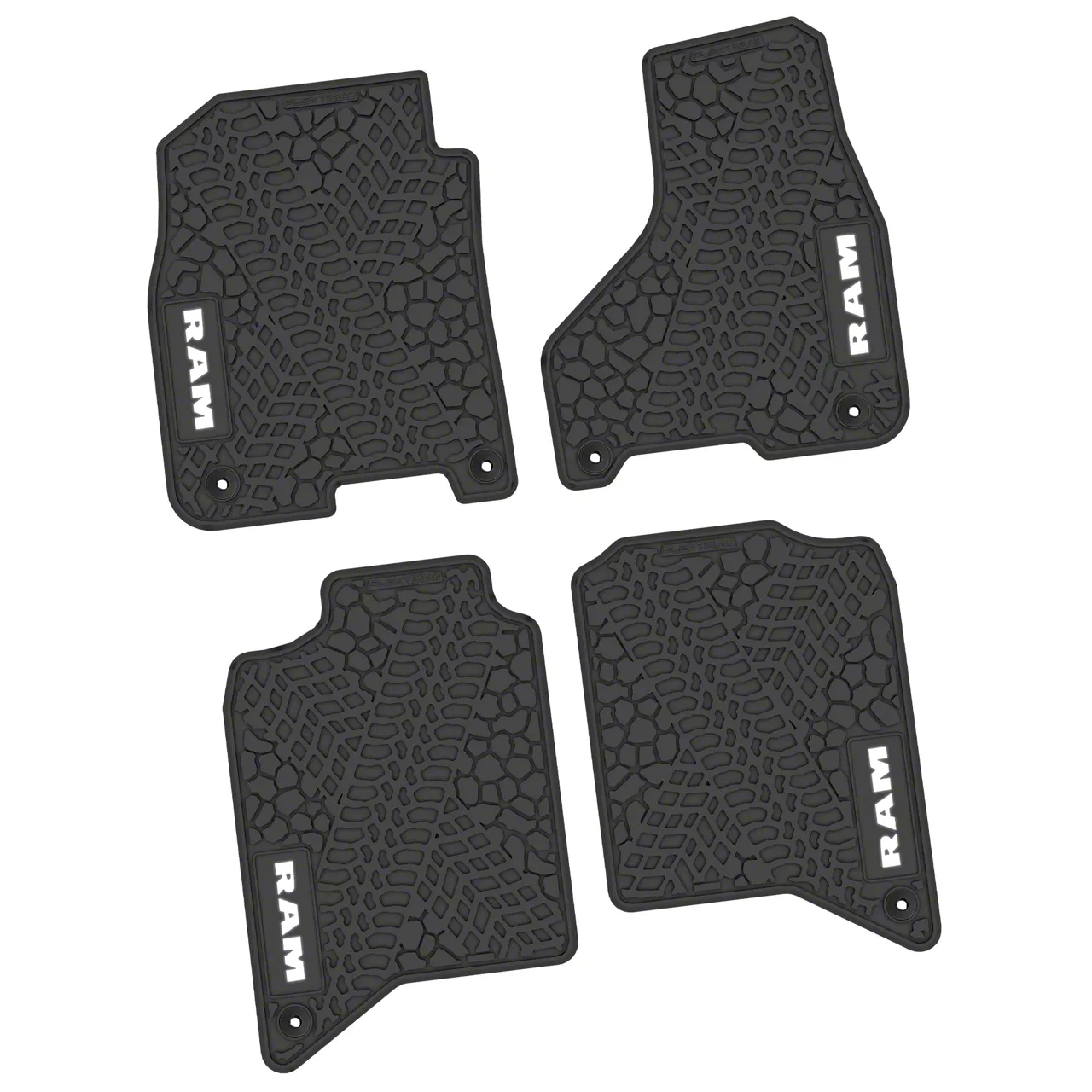 Design. Enhancing the aesthetic appeal, these FLEXTREAD Factory Floorpan Fit Tire Tread/Scorched Earth Scene Front and Rear Floor Mats feature a striking white RAM logo and text insert. This design element pays homage to the RAM brand, showcasing loyalty and pride while adding a touch of elegance to the vehicle's interior.