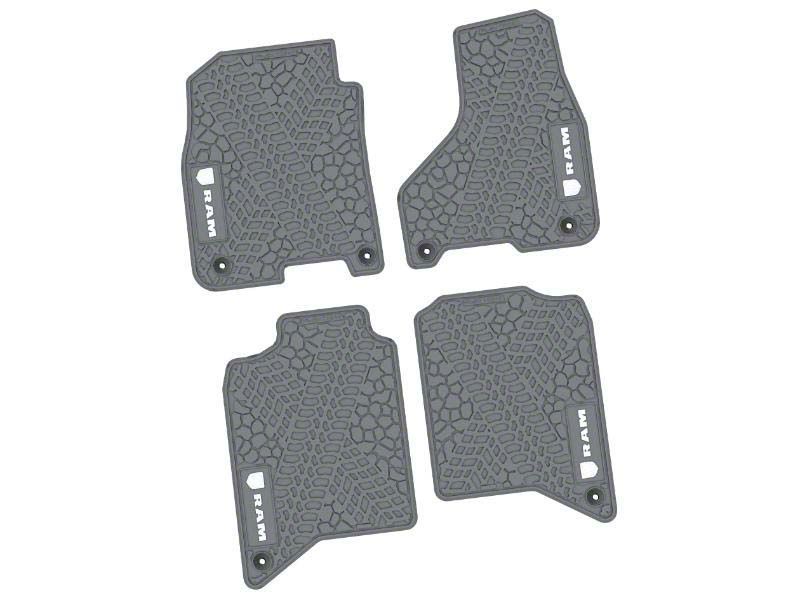 Factory Floorpan Fit Tire Tread/Scorched Earth Scene Front and Rear Floor Mats with White RAM Logo and Text Insert; Grey (19-26 RAM 3500 Crew Cab)Find parts that fit my vehicle