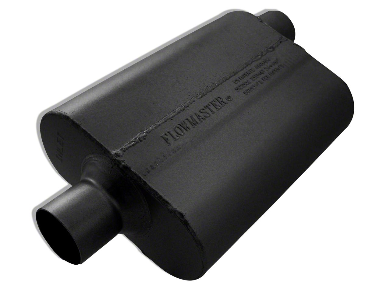 Out-Scavenge the Competition. The Flowmaster 40 Series Delta Flow Center/Offset Oval Muffler - 2.5" inlet/outlet precisely places and welds 3 internal baffles to exact specifications to significantly reduce the exterior resonance and sound levels that get transmitted into the vehicle through the exhaust. Ideal for street, strip, and off-road applications.