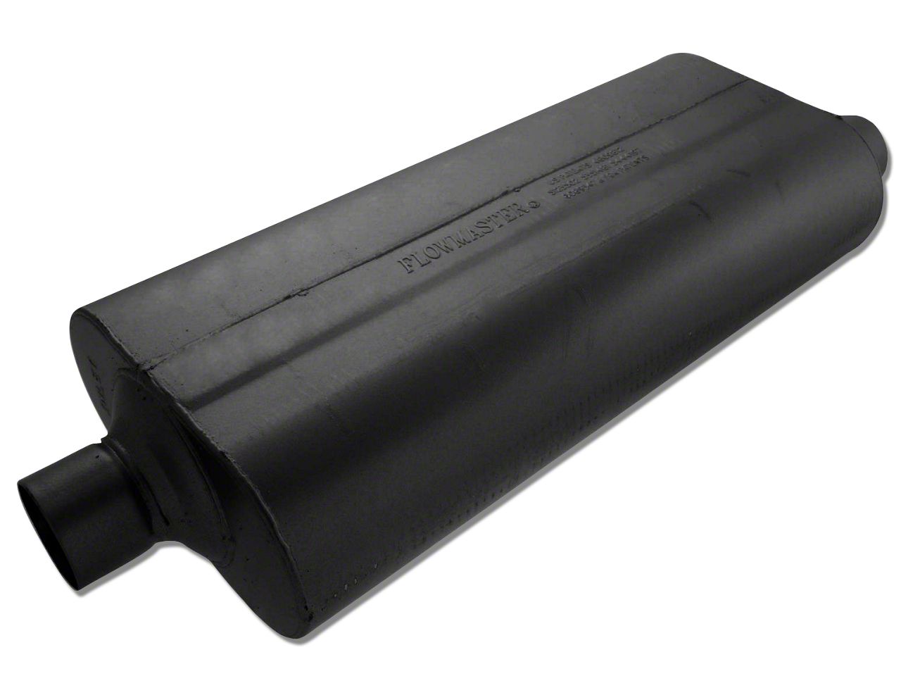 Mellow Exhaust Note. This 70 Series 2.5 in. Center/Offset Muffler uses Flowmaster's Delta Flow Technology to emit a mild external sound so you needn't worry about waking up the neighborhood. With only minimal drone inside the cab, your driving experience can be more enjoyable.