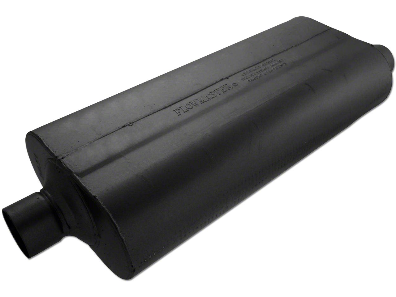 High-Quality Construction. The 2.5” Flowmaster 70 Series Center/Offset Oval Muffler is made from MIG welded 3” 16 aluminized steel that guarantees extreme durability. This ensures that the muffler continues to deliver optimal performance for a longer period. Not only will you get improved performance but also a deep muscular exhaust note that rivals other muscle cars. The muffler is fully designed and assembled in the USA to guarantee quality.