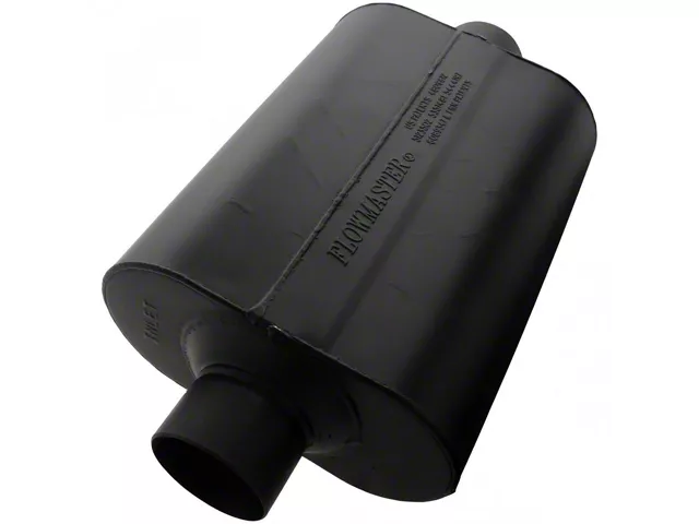 Aggressive Performance Muffler. The Flowmaster Super 40 Series Center/Center Oval Muffler is designed to deliver a deep, powerful exhaust tone while enhancing performance on high-horsepower vehicles. Utilizing race-proven Delta Flow technology, this muffler improves exhaust scavenging while maintaining moderate interior resonance for a balance of sound and comfort.