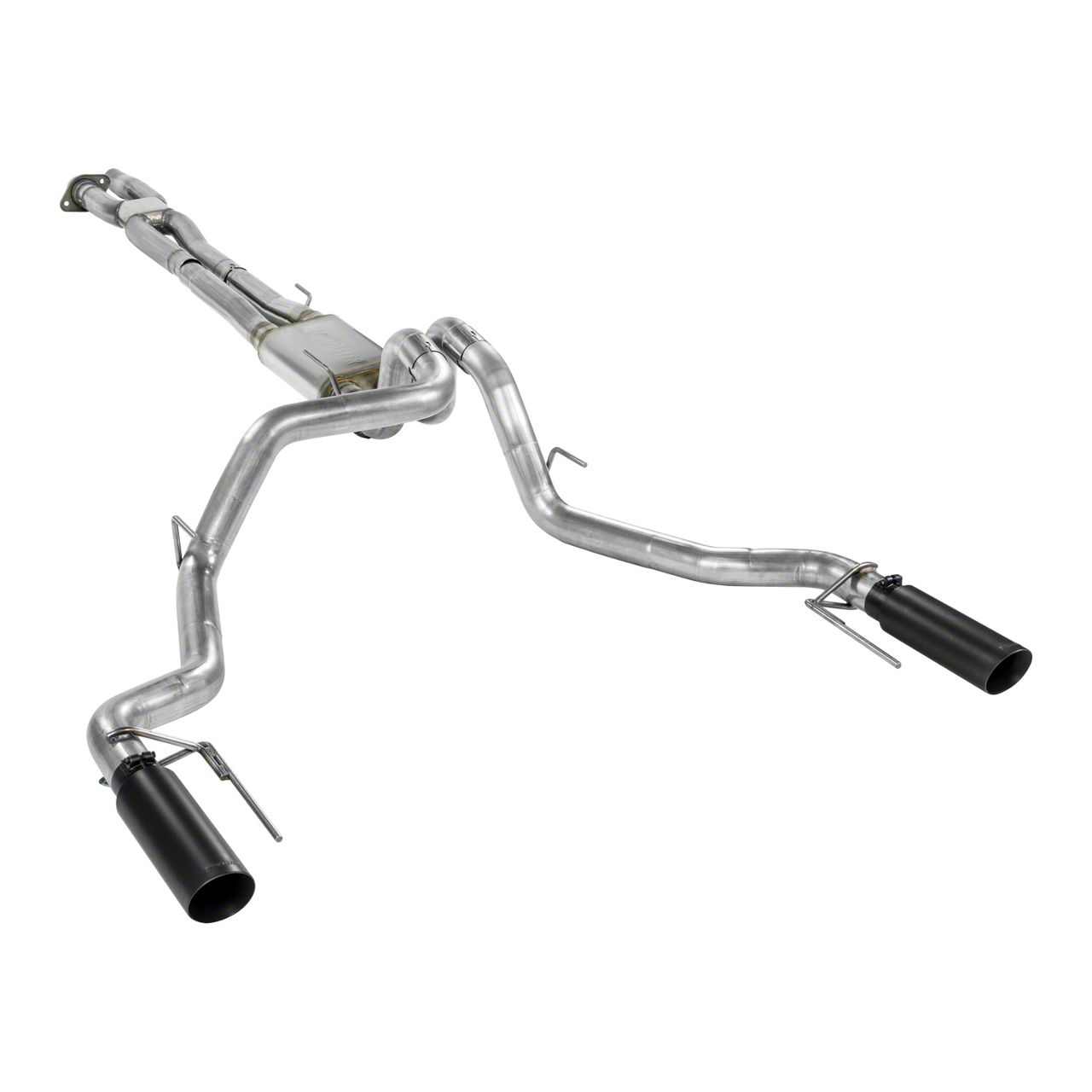 Custom-Designed System. The entire construction of this FlowFX Cat-Back Exhaust is built to last. The bright 409S stainless steel with brushed finish tubing and pipe assembly are made to withstand even the harshest driving conditions. The tips are black ceramic-coated for maximum protection against wear and tear. The split rear exit design will also provide extreme style to the rear view of your F-150.