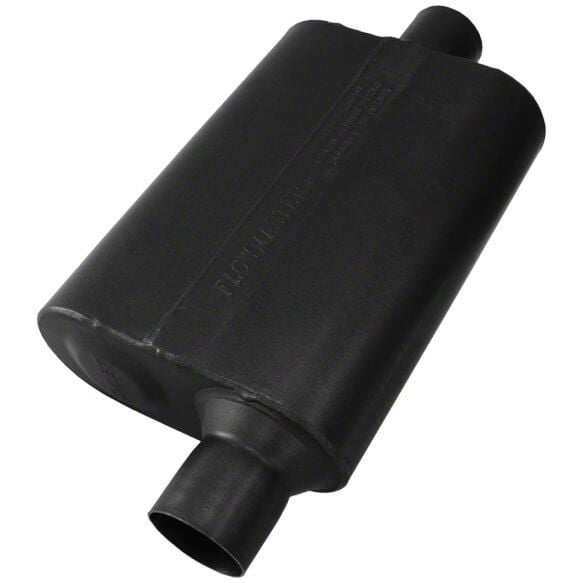 Application. This Oval Muffler features a universal fit with a 2.50-inch inlet and 2.50-inch outlet, making it suitable for various vehicles and setups.