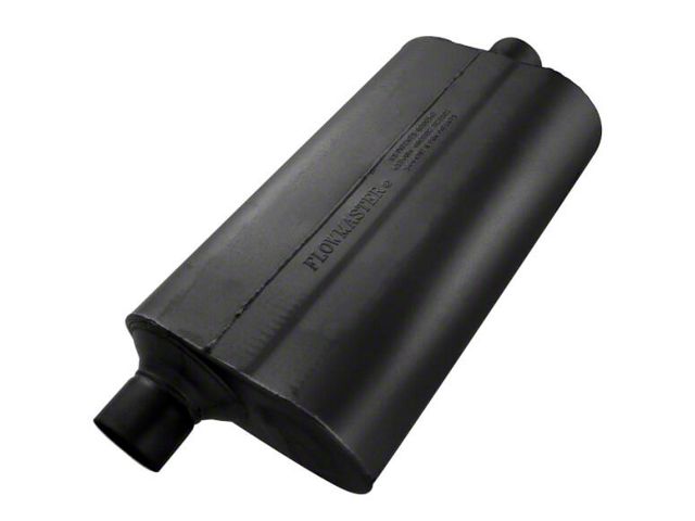 Durable MIG Welded Construction. Made for a universal fit, this Flowmaster Super 50 Series Offset/Center Oval Muffler was made for use in trucks and SUVs and has a matte black finish. Built with a 2.50 inch inlet and outlet, this model is larger than the Delta Flow series models and is crafted from durable MIG welded 16 gauge aluminized steel.