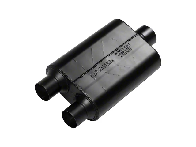 Powerful Exhaust Upgrade. The Flowmaster 40 Series Dual In/Center Oval Muffler is designed to provide a bold sound profile and exceptional performance. This muffler delivers a deep and aggressive exterior exhaust note, while also producing a distinct resonance inside the cabin. It is a solid choice for drivers who want their vehicle to stand out both in sound and in performance on the street or at the track.