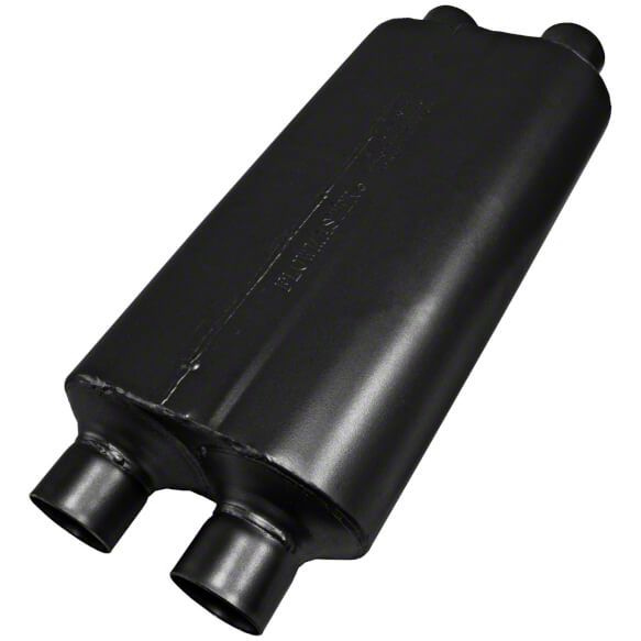 Upgrade Your Exhaust. The Flowmaster 50 Series HD Dual In/Dual Out Oval Muffler delivers exceptional exhaust flow and performance for drivers looking to enhance their vehicle's sound and efficiency. Its dual in/dual out design with 2.50-inch inlets and outlets optimizes power and efficiency, while the oval shape ensures a compact fit in tighter spaces. This muffler significantly reduces interior resonance, providing a mellow yet aggressive exhaust note perfect for daily drivers or off-road vehicles.