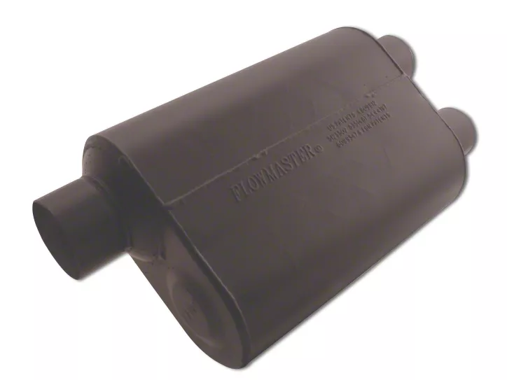 Built to Perform. The 3”/2.5” Flowmaster 40 Series Offset/Dual Out Oval Muffler is designed to give you the aggressive performance of a race car and the moderate exhaust noise elegance of a luxury car. This muffler features the unparalleled delta flow technology that delivers improved flow, better engine efficiency, improved mileage and increased torque and horsepower. It is comes with a three chambered design and internal tubing that delivers a moderate street legal growl that you will love.