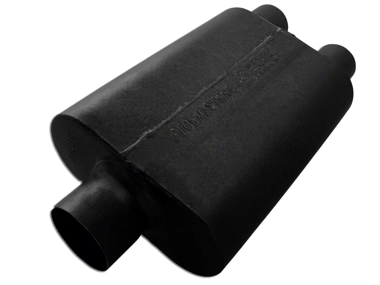 Durable Construction. Fully MIG-welded, this Super 44 Series Oval Muffler from Flowmaster is made from 16-gauge, 409S stainless steel, making it very durable and resistant to corrosion. With an attractive black finish, this chambered muffler improves both torque and horsepower along with improving the sound of your truck. There is one 3”, centered inlet pipe and dual 2.5” outlet pipes, giving an overall size of 19” and a width of 9.75”. The body of the muffler itself is 13” x 4”, and it is sold individually.