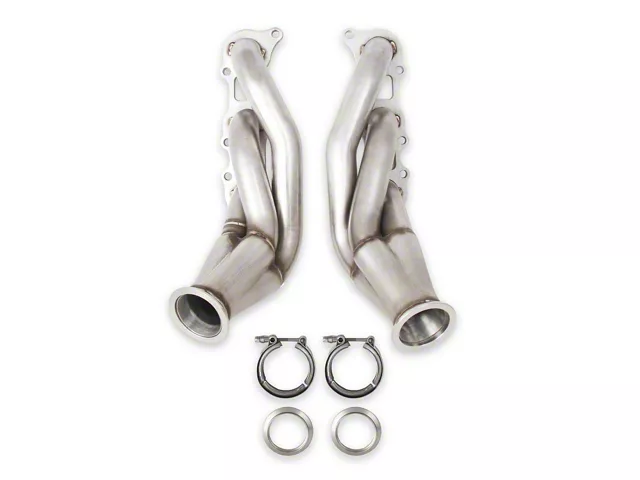 Construction and Appearance. These headers are crafted from 304 stainless steel with a natural finish for strength and corrosion resistance. They feature 1-5/8-inch mandrel-bent primary tubes, 2.5-inch collectors with merge spears, and thick 7/16-inch flanges to ensure a leak-free seal. For additional options, they are also offered in ceramic-coated mild steel or polished stainless steel finishes.