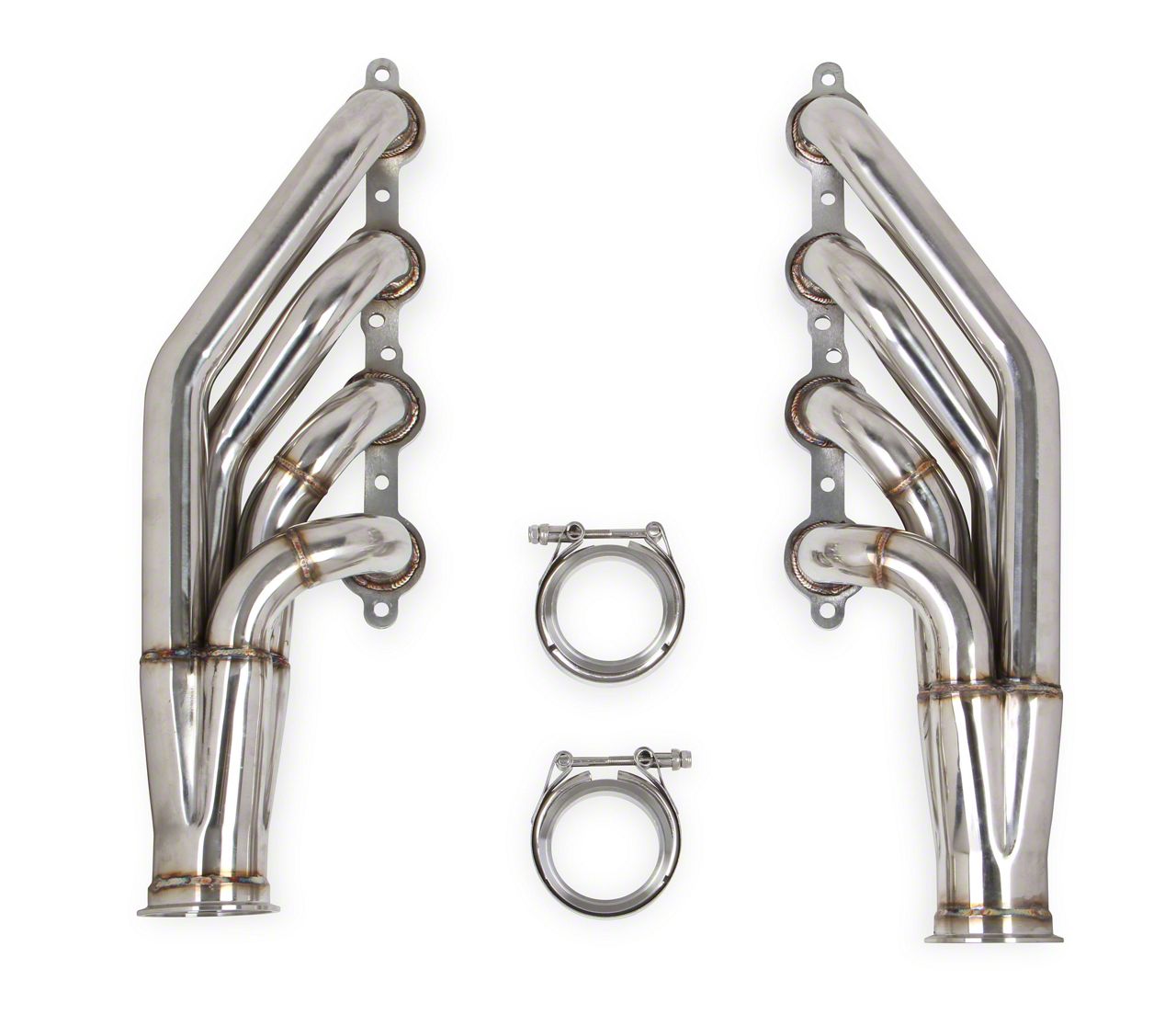 Construction and Appearance. Crafted from 1-7/8 and 1-3/4-inch CNC mandrel-bent 409 stainless steel tubing, these headers offer superior strength and precision. They feature a 3-inch collector with a 7/16-inch-thick header flange to ensure durability and proper sealing under high boost conditions. The raw metal finish highlights their rugged performance character, while aluminum header gaskets and 3-inch V-band flanges and clamps are included for secure connections.