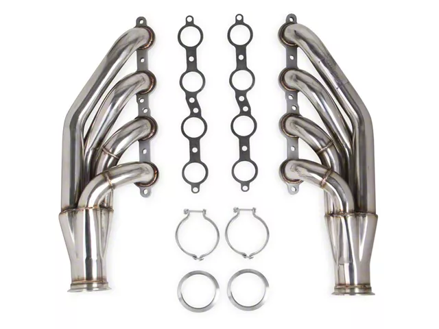 Construction and Appearance. Built from premium 1-3/4-inch 304 stainless steel tubing, these headers are crafted for strength, corrosion resistance, and long-term performance under extreme conditions. The raw metal finish highlights their race-ready design, while 3-inch collectors and 7/16-inch-thick header flanges ensure optimal sealing and flow stability. Each set includes premium gaskets, clamps, and V-band flanges for a complete, high-quality installation.