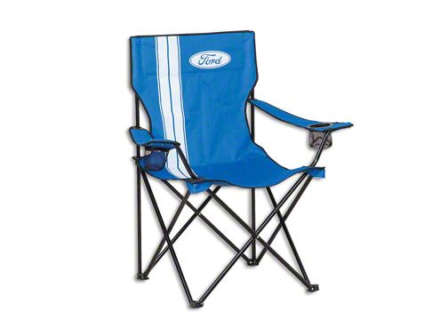 Quality Construction. Manufactured from high quality steel tubing with a black powdercoat for corrosion resistance, this Folding Chair features a Ford logo on the chair back. Complete with a mesh cup holder on each arm rest, the blue 600 denier polyester fabric features contrasting white stripes to increase it's visual style.