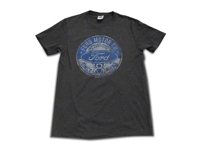 Distressed Emblem. Wear this blue short-sleeved T-shirt at car rallies to show your allegiance to Team Ford. Made from 100 percent cotton, the Ford Motor Co. T-Shirt features the officially-licensed navy and white Ford oval logo above vintage blue and red lettering that says “Ford Performance.” A distressed circular emblem in the background also says Ford Performance.