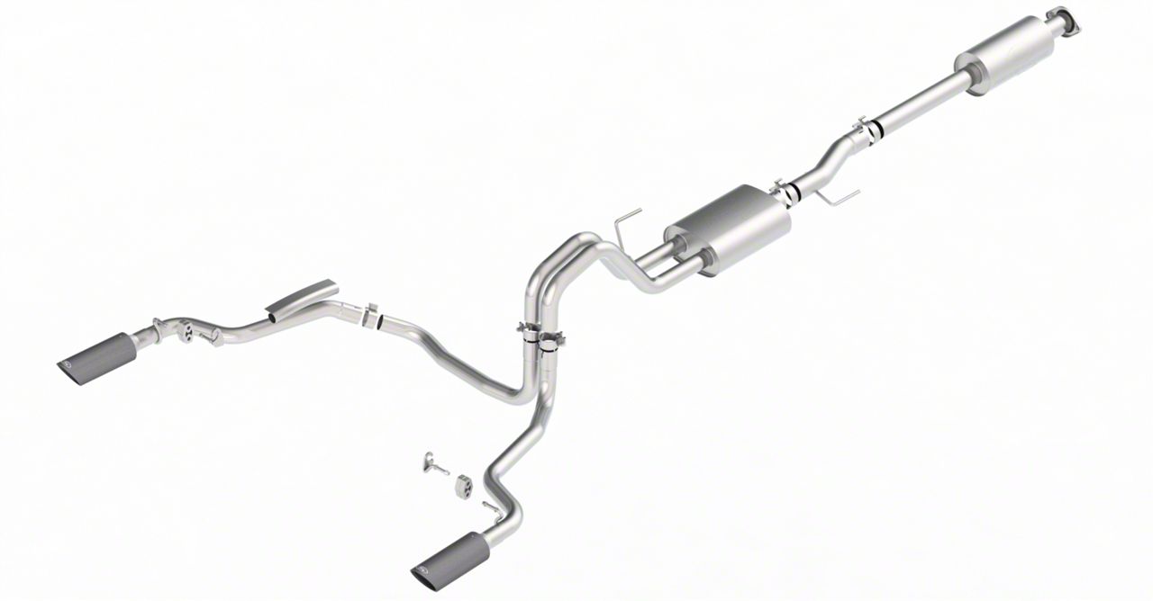 Boosts Driving Experience. Maximize the sportiness of your Ford F-150 with the Ford Performance by Borla Sport Dual Exhaust System with Carbon Fiber Tips and a Rear Exit. Characterized by ultra-smooth mandrel bends, warp-free flanges, and 4-inch carbon fiber tips, this system is made to supply an aggressively rich sound to heighten your thrill when driving, whether you are conquering the trail or making your way around town.
