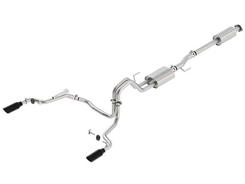 Adept on the Road. In addition, the Ford Performance by Borla Sport Split Rear Exit Cat-Back Exhaust with Black Chrome Tips adds to the overall performance of your Ford F-150. By changing from the stock system, you upgrade to free-flowing exhaust, which improves on your truck's power and fuel efficiency.