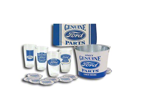 A Full Bar Set. You’ll have everything you need for enjoying the bar with your buddies with the Ford Pint Glass Gift Set. The 18-piece set includes 4 pint glasses, 12 coasters, a 5-quart metal bucket for ice or beer, and a 100% terry cotton towel. Each piece is proudly emblazoned with a Ford Genuine Parts logo.