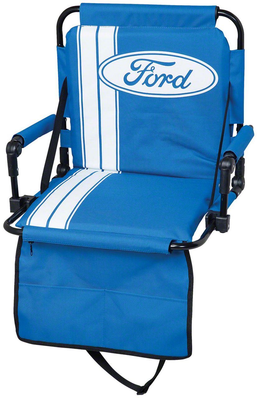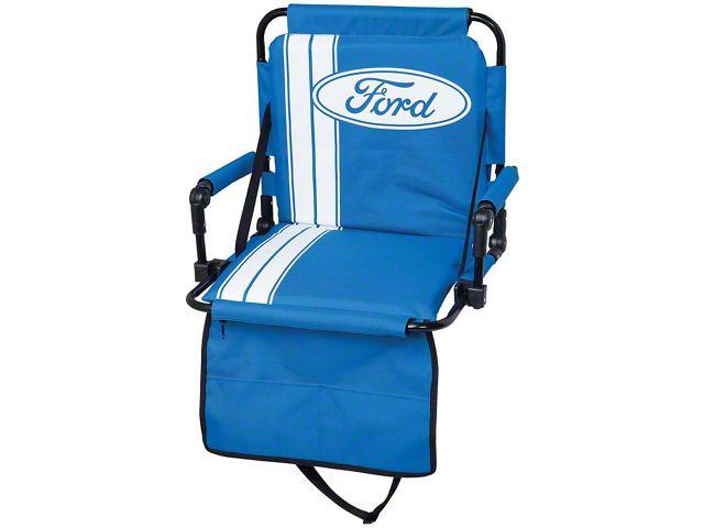 Designed for Comfort. If you're a racing or sporting enthusiast and enjoy the Ford brand, you'll be sure to love this Ford Stadium Seat. It's the perfect item to take with you when you're outdoors watching an event or just socializing with friends. This seat was designed for superior user comfort with the padded seat bottom, back, and arms. It features two storage pockets for your convenience. You'll love how simple it is to transport this seat with the convenient carry strap.
