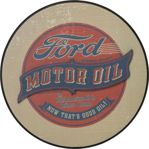 Ford Motor Oil. Give any boring old wall some serious Ford attitude with a "Ford Motor Oil" Pub Sign. Featuring a vintage "Ford Motor Oil" style logo in blue and orange, this circular pub sign features a routered edge with a raised motor oil banner for added dimension making it perfect for your garage, den, or dorm room.