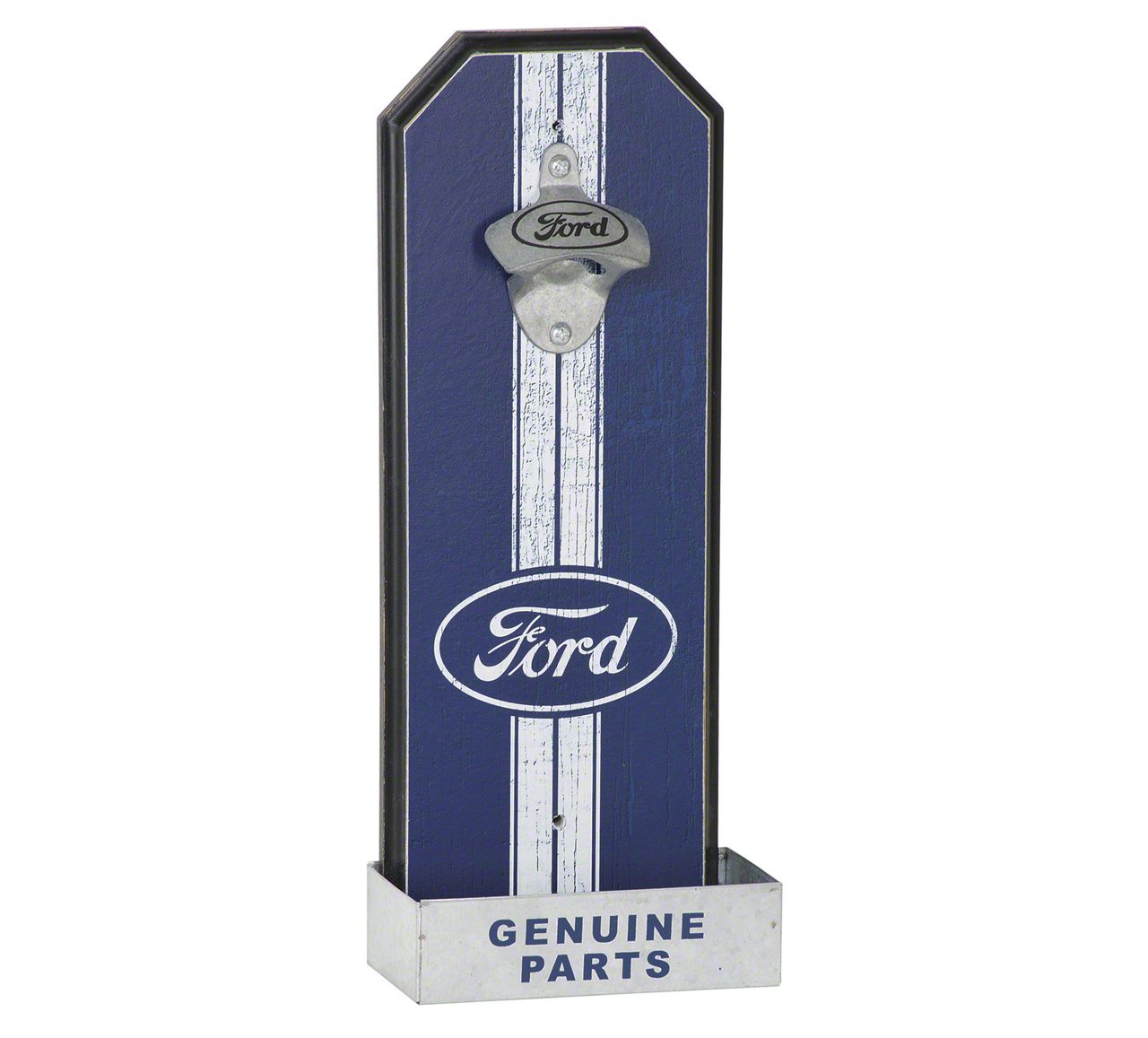 Bottle Opener. This Ford themed Wall Mount Bottle Opener with removable cap catcher is ideal for your home bar, garage, or where ever enjoy a cold one. This functional accent piece features metal and wood construction and includes mounting hardware.